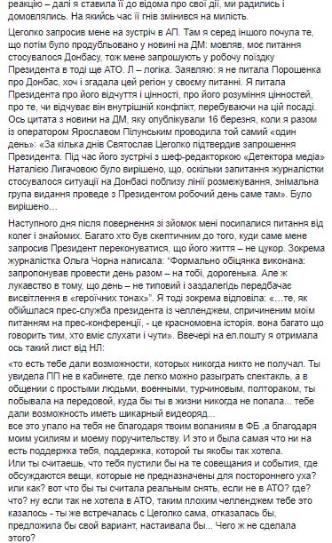 "Цеголко пригласил меня на встречу в АП. Там я среди прочего услышала то, что потом было продублировано в новости ДМ: мол, мой вопрос касался Донбасса, поэтому меня приглашают в рабочую поездку президента в тогда еще АТО. Заявляю: я не спрашивала Порошенко о Донбассе, хотя и вспомнила этот регион в своем вопросе. Я спрашивала президента о его чувствах и ценностях, о его понимании ценностей, о том, чувствует ли он внутренний конфликт, находясь на этом посту", - пишет Барановская.