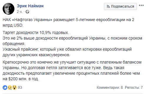 "НАК "Нафтогаз Украины" размещает 5-летние еврооблигации на 2 млрд.USD. Таргет доходности 10,9% годовых. Это на 2% выше доходности еврооблигаций Украины, с похожим сроком обращения. Ужасный прайсинг, который уже обвалил котировки еврооблигаций других украинских квазисуверенов", - написал он.
