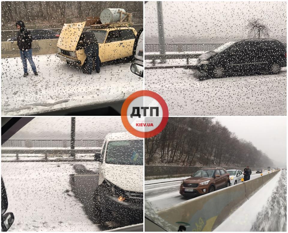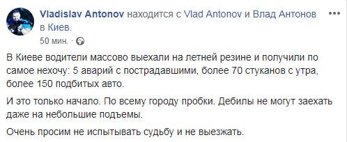Первый снег, который выпал в Киеве 14 ноября, стал причиной повышенной аварийности на улицах столицы. Об этом на своей странице в Facebook пишет киевлянин Владислав Антонов.