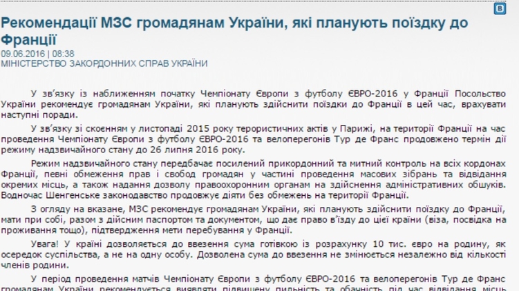 В период проведения матчей Чемпионата Европы по футболу Евро-2016 гражданам Украины рекомендуется проявлять повышенную бдительность во время посещения мест массового скопления людей (футбольные фан-зоны, музеи и т. п), известных исторических памятников, четко выполнять все указания и рекомендации сил безопасности и местной власти, быть готовыми к проверке документов и личного контроля представителями правоохранительных органов, всегда иметь при себе документы, удостоверяющие личность, отслеживать информацию относительно мер безопасности в местах пребывания.