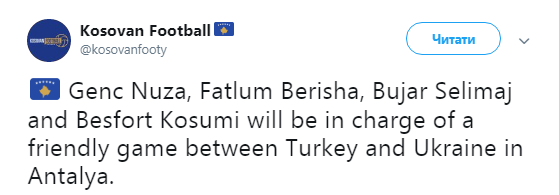 Во вторник, 20 ноября, товарищеский матч футбольных сборных Турции и Украины обслужит бригада арбитров из Косово во главе с Генцем Нуза. Его ассистентами станут Фатлум Бериша, Бухар Селимай.