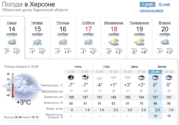 По прогнозу sinoptik.ua, в Херсоне ночью минимальная температура ночью достигала -7 градусов. Днем поднялась лишь до +3.