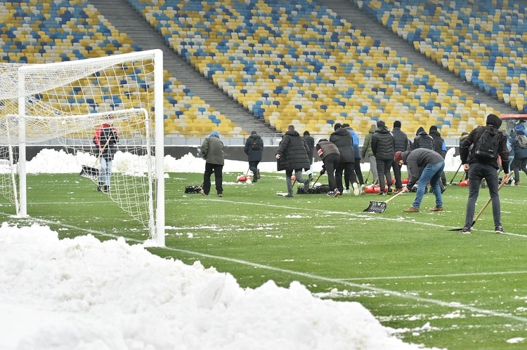 Работники стадиона с помощью студентов-волонтеров Национального университета физического воспитания и спорта Украины очистили газон от снега, передает пресс-служба ФФУ.