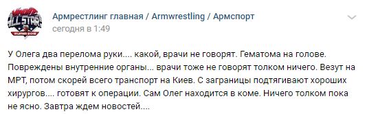 Известный украинский армрестлер Олег Жох 14 ноября впал в кому после жуткой аварии, которая вчера произошла в Ровенской области на автодороге Киев-Чоп. Как сообщает сообщество Армрестлинг ВКонтакте, у Жоха перелом левой руки в двух местах, подтвердилась гематома на голове и сильные ушибы легких. На завтра назначено повторное МРТ.