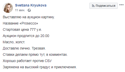 "...Название "Prosecco". Стартовая цена 777 у.е. Аукцион продлится до 20.00. Масло, холст. Доставлю лично. Трезвая. Ставки делаем прямо тут, в комментах. Хорошо работает против СБУ Заряжена на высокий градус и приключения", - сказано в подписи к посту.