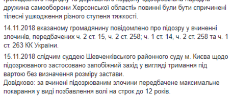 15 ноября следственный судья Шевченковского районного суда г.Киева в отношении подозреваемого применил меру пресечения в виде содержания под стражей без определения размера залога.