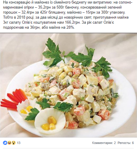 "В 2017 году приготовление почти 3 кг салата "Оливье", которых будет достаточно для большой семьи из 8 человек, обошлось бы в 130,2 грн", - написал Дорошенко.