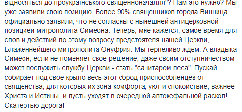 В Виннице в епархиальное управление вызывались на беседы священнослужители, которые наиболее благосклонны к позиции митрополита Симеона, который не подписал постановление, осуждающее намерение Константинополя предоставить автокефалию украинской церкви. Об этом в Facebook сообщил винницкий священник Виктор Парандюк.