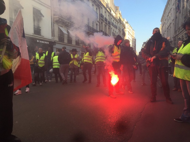 В Париже полиция применила слезоточивый газ против протестующих на Елисейских полях. Часть демонстрантов собралась возле резиденции французского президента Эммануэля Макрона требуя его отставки.