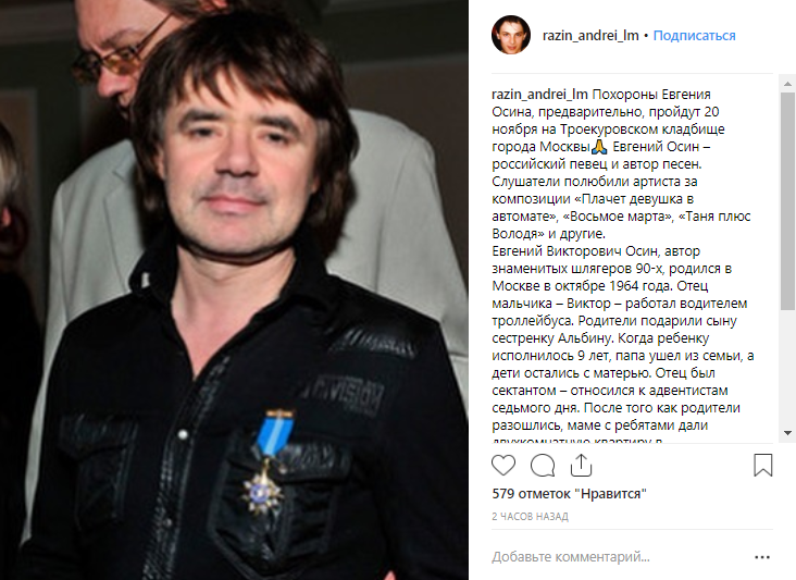 Певца Евгения Осина, который скончался сегодня в своей московской квартире, похоронят, во вторник, 20 ноября на Троекуровском кладбище в Москве. Об этом сообщил музыкальный продюсер Андрей Разин на своей странице в Instagram.