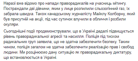 Сегодняшние события показали, что в Украине все повышается уровень праворадикальной агрессии и насилия. Полиция под давлением радикальных групп заявила, что не способна обеспечить безопасность. Таким образом, полиция вообще не способна обеспечить реализацию прав и свобод человека. Мы расцениваем данную ситуацию как праворадикальную диктатуру, которая устанавливается в Украине".