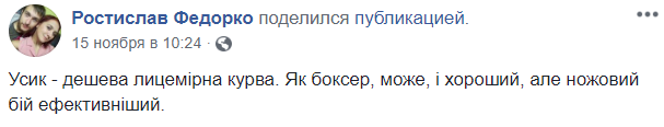 У Федорко есть страница в Facebook. На ней он агитирует за Томос, называет боксера Александра Усика "лицемерной курвой" и делится всеми эфирами Корчинского.