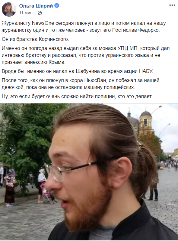 По ее словам, именно Федорко полгода назад выдал себя за монаха УПЦ МП, который дал интервью братству и рассказал, что против украинского языка и не признает аннексию Крыма. Также, он мог напасть на Виталия Шабунина во время акции НАБУ.