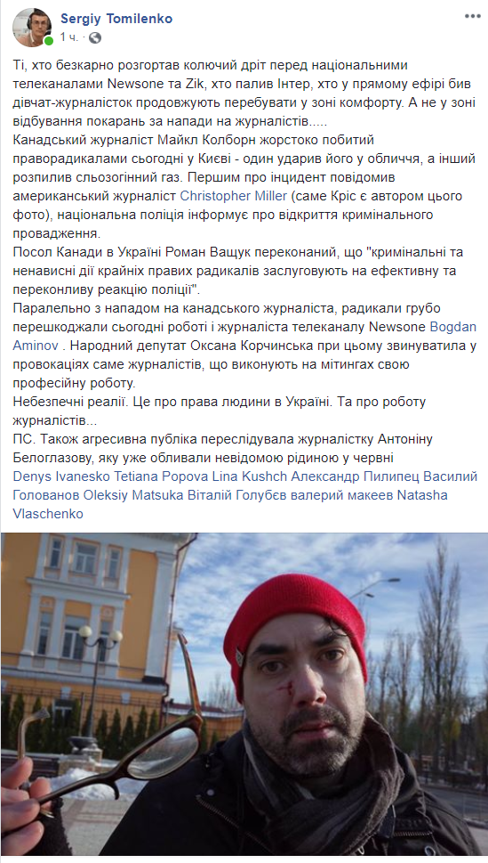 "Канадский журналист Майкл Колборн жестоко избит праворадикалами сегодня в Киеве - один угодил ему в лицо, а другой распылил слезоточивый газ. Первым об инциденте сообщил американский журналист Christopher Miller (именно Крис является автором этого фото), национальная полиция информирует об открытии уголовного производства. Посол Канады в Украине Роман Ващук убежден, что "уголовные и ненавистные действия крайне правых радикалов заслуживают эффективную и убедительную реакцию полиции", пишет Томиленко.