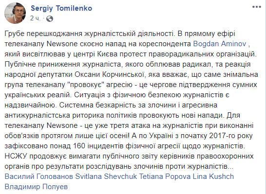 "Параллельно с нападением на канадского журналиста, радикалы грубо препятствовали сегодня работе и журналиста телеканала Newsone Bogdan Aminov. Народный депутат Оксана Корчинский при этом обвинила в провокациях именно журналистов, выполняющих на митингах свою профессиональную работу. Опасные реалии. Это о правах человека в Украине. И о работе журналистов", заключает глава НСЖУ.