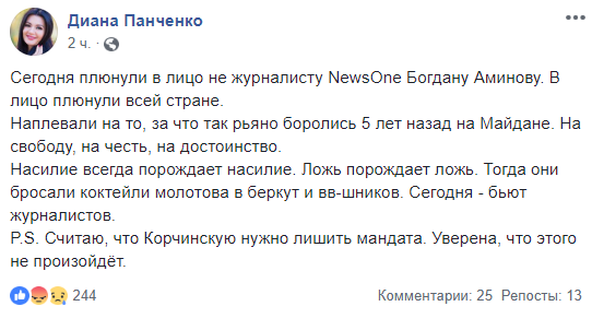 Коллега Богдана Аминова телеведущая Диана Панченко рассказала, что плевок в лицо журналиста можно сравнить с последствиями борьбы за идеи Майдана. А нардепа Оксану Корчинскую предложила лишить мандата за причастность к случившемуся.