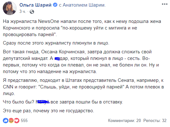 Как сообщала "Страна", на журналиста NewsOne напали после того, как к нему подошла жена Корчинского и попросила "по-хорошему уйти с митинга и не провоцировать парней". Сразу после этого журналисту плюнули в лицо.