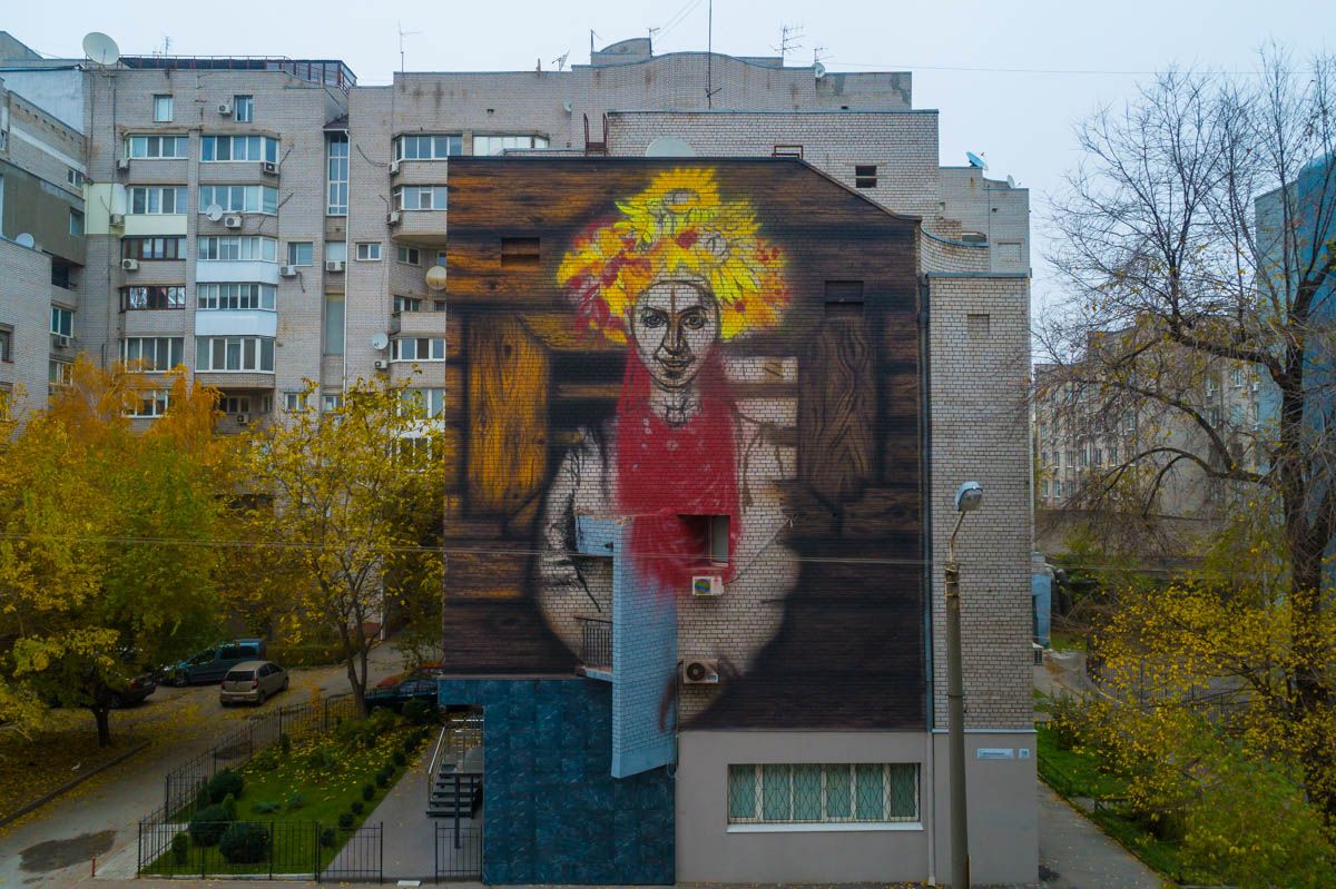 В Днепре появился мурал со свирепой украинкой в венке из осенних листьев