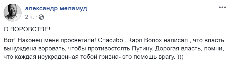 "Вот! Наконец меня просветили! Спасибо. Карл Волох написал, что власть вынуждена воровать, чтобы противостоять Путину. Дорогая власть, помни, что каждая неукраденная тобой гривна- это помощь врагу", пишет столичный бизнесмен и меценат Александр Меламуд.