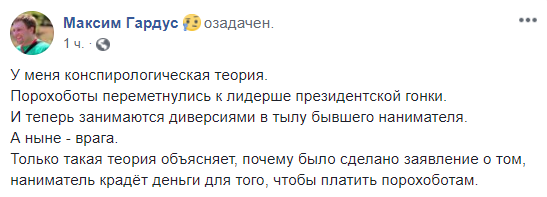 И теперь занимаются диверсиями в тылу бывшего нанимателя. А ныне - врага. Только такая теория объясняет, почему было сделано заявление о том, наниматель крадёт деньги для того, чтобы платить порохоботам", - пишет эксперт по энергетике Максим Гардус.