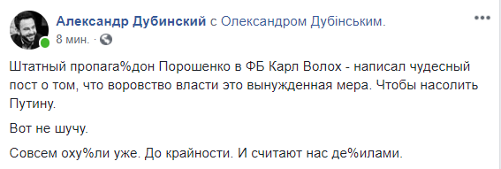 "Штатный пропага%дон Порошенко в ФБ Карл Волох - написал чудесный пост о том, что воровство власти это вынужденная мера. Чтобы насолить Путину. Вот не шучу. Совсем оху%ли уже. До крайности. И считают нас де%илами", пишет возмущенный журналист Александр Дубинский.