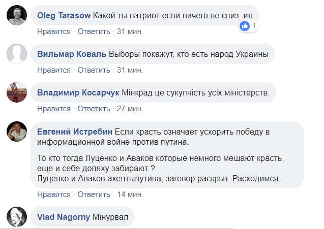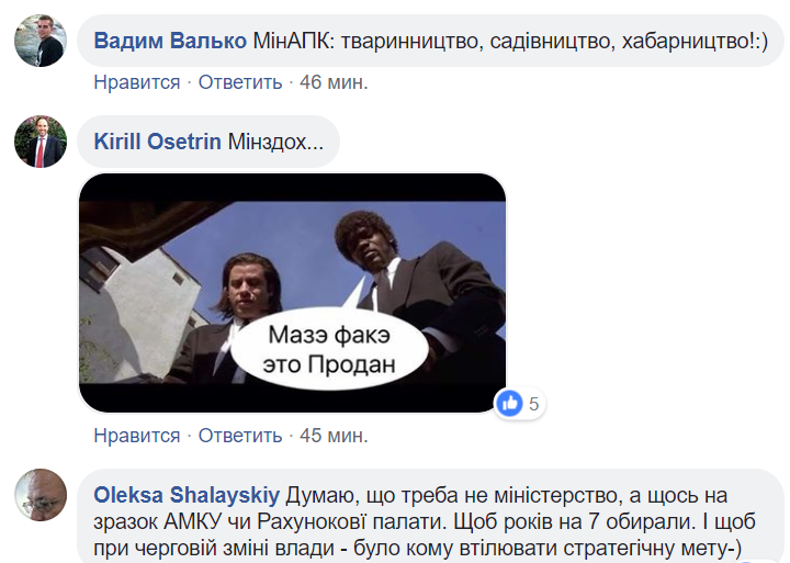 "Мінюст, Міненерго, Мінкрад", отреагировал на пост Волоха журналист Дмитрий Гнап. В комментариях к его публикации на Facebook пользователи делятся разнообразными фотожабами на тему откровений Волоха.