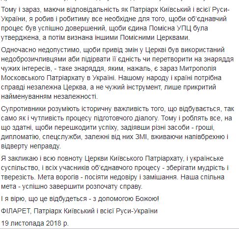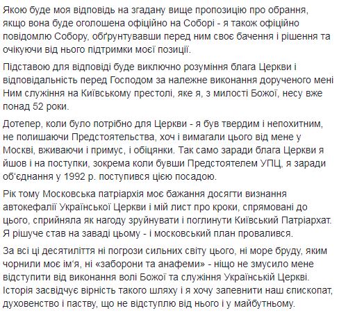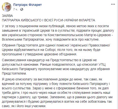 В то же время Филарет напомнил, что "избрание предстоятеля единой поместной Украинской православной церкви будет происходить на объединенном соборе после того, как на нем будет провозглашено и утверждено церковное объединение". Он также добавил, что самовыдвижение главы церкви не предусмотрено.