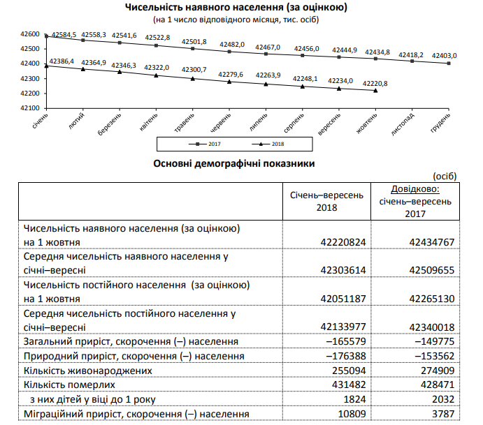 Также известно, что в промежуток времени с января по сентябрь 2018 года смертность почти в два раза превысила рождаемость. На 100 умерших украинцев приходится 59 живорожденных.