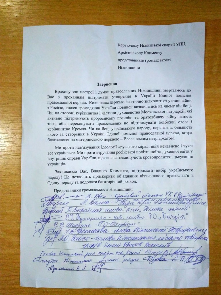 В сообщении речь идет о том, что 19 ноября в епархиальное управление пришла группа людей, в которую входили заместитель председателя Нежинской РГА Мелашенко, заместитель Нежинского городского головы Дзюба, а также представители общественности. Они обвинили церковников в непатриотизме. Кроме того, представители власти и активисты оставили письмо в адрес архиепископа Нежинского и Прилукского Климента с призывом поддержать создание Единой поместной православной церкви, подписанное председателем и депутатами Нежинской РГА.
