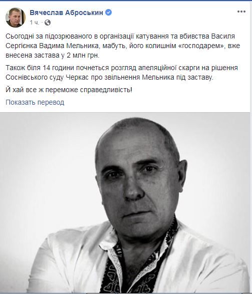 "Сегодня за подозреваемого в организации пыток и убийства Василия Сергиенко Вадима Мельника, по-видимому, его бывшим "хозяином", уже внесен залог в 2 млн грн", - отметил Аброськин. Он уточнил, что 20 ноября примерно в 14:00 должно начаться рассмотрение апелляционной жалобы на решение Сосновского суда Черкасс об освобождении Мельника под залог.