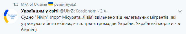 "Судно "Nivin" (порт Мисурата, Ливия) освобожден от нелегальных мигрантов, которые взяли в плен его экипаж, в том числе трех украинцев. Украинские моряки - в безопасности", - говорится в сообщении.