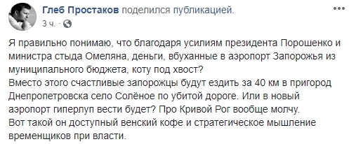 Эту запись перепостил на своей странице журналист Глеб Простаков. Он сопроводил перепост комментарием о том, что теперь своего аэропорта у Запорожья не будет: "Я правильно понимаю, что благодаря усилиям президента Порошенко и министра стыда Омеляна, деньги, вбуханные в аэропорт Запорожья из муниципального бюджета, коту под хвост?