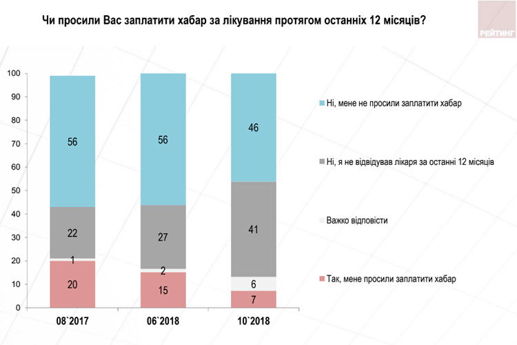 В то же время четверть украинцев не увидели никаких изменений после заключения договора, а еще 22% вообще не были у своего врача после подписания контракта. 7% респондентов заявили, что у столкнулись с фактами коррупции при получении медицинских услуг. 46% говорят, что за последних 12 месяцев у них не просили заплатить взятку за лечение. Еще в июне таких было на 10% больше.