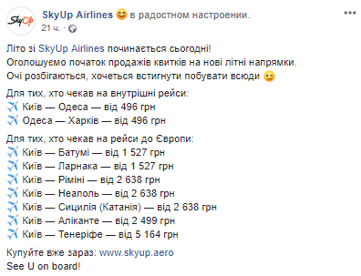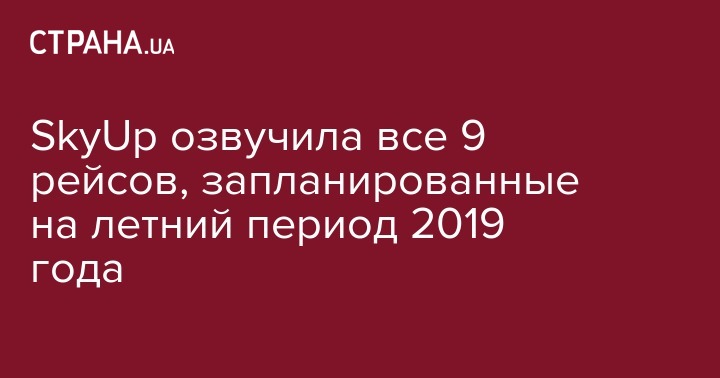 Авиакомпания SkyUp откроет 2 внутренних рейса и 7 международных в период летней навигации в 2019 году. Об этом говорится в сообщении компании на странице в Facebook.