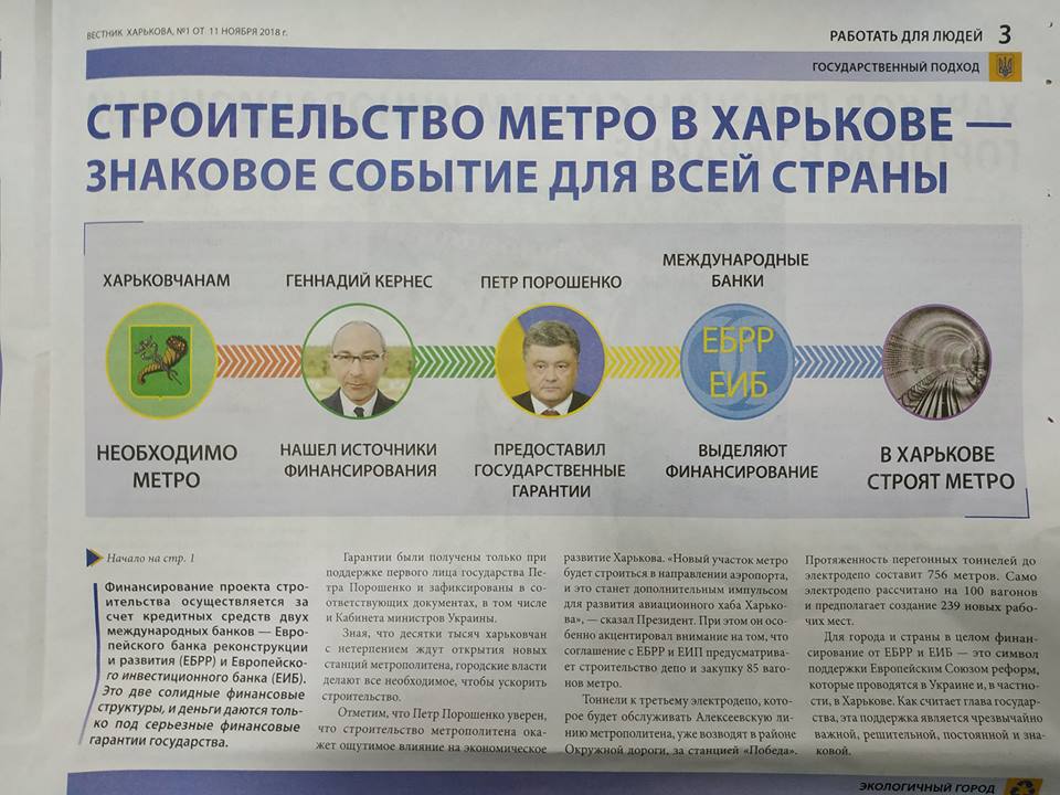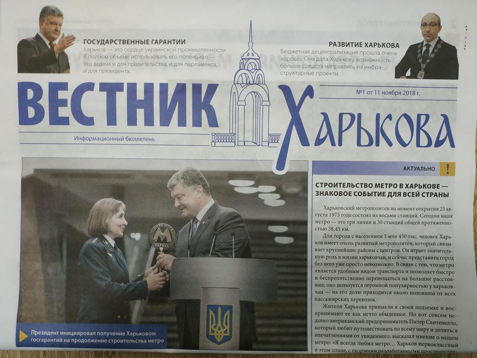 Житель Харькова Владимир Рисенко показал на своей странице в соцсети изображение газеты "Вестник Харькова", которая, судя по всему, имеет превыборную направленность. На первой полосе изображены президент Украины Петр Порошенко и мэр города Геннадий Кернес.