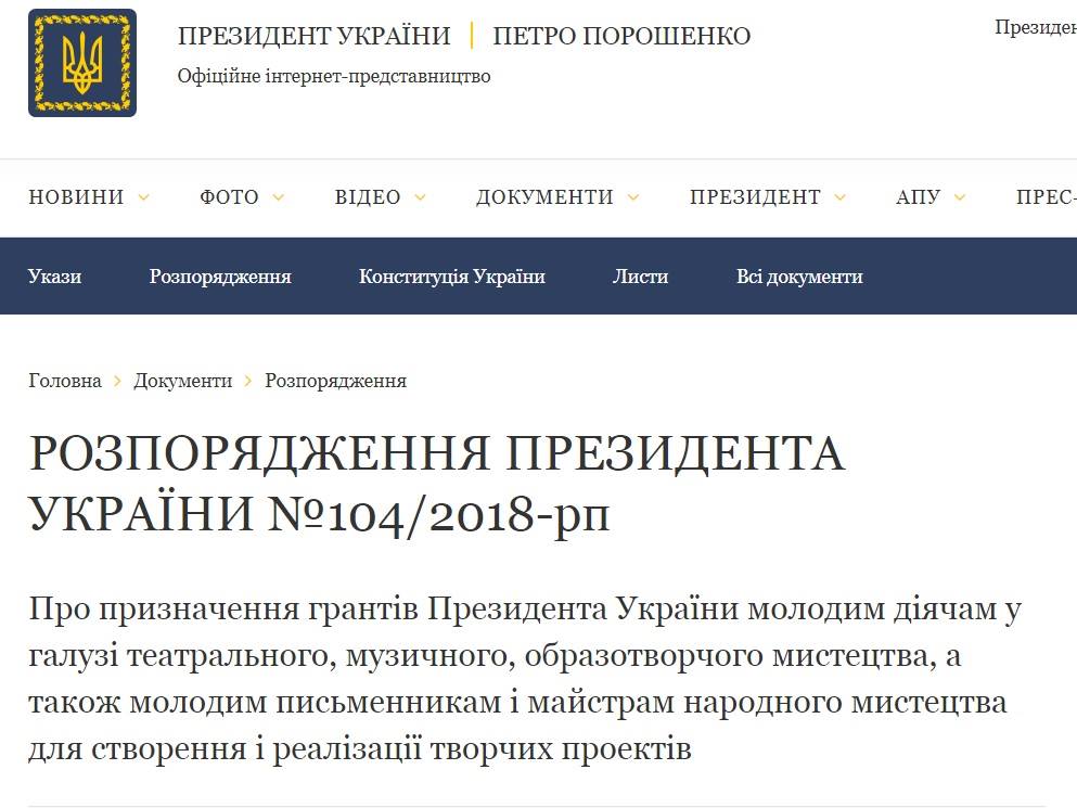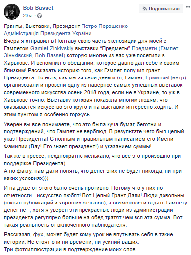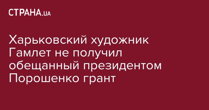 Харьковский художник Гамлет Зиньковский не получил обещанный грант от президента Украины Петра Порошенко, несмотря на то, что распоряжение было подписано главой государства еще в июле 2018 года. Об этом на своей странице в Facebook сообщил его коллега и соавтор выставки "Предметы" Сергей Петров ("Bob Basset").