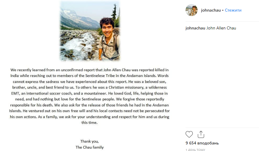 Родные Джона Чау опубликовали в его инстаграме пост о его смерти. Они попросили освободить задержанных по делу о его убийстве, поскольку те "не должны быть наказаны за его действия".
