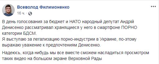 В четверг, в день голосования за бюджет-2019, внефракционный народный депута, экс-глава Правого сектора в Днепре Андрей Денисенко рассматривал хранящиеся у него в смартфоне порно категории БДСМ. Об этом сообщил журналист Всеволод Филимоненко в Facebook. Он также привел видеодоказательства этого.