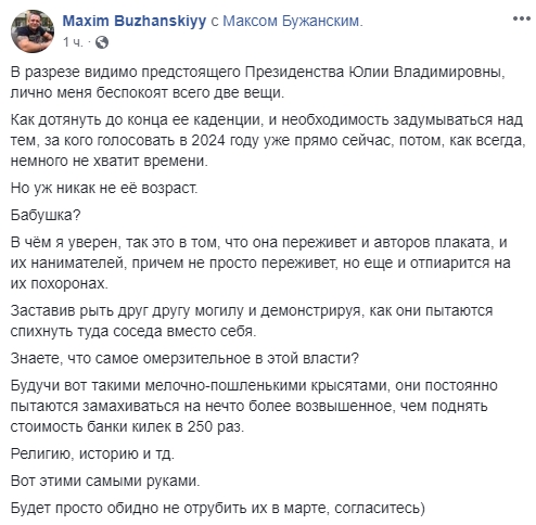 Знаете, что самое омерзительное в этой власти? Будучи вот такими мелочно-пошленькими крысятами, они постоянно пытаются замахиваться на нечто более возвышенное, чем поднять стоимость банки килек в 250 раз. Религию, историю и тд. Вот этими самыми руками. Будет просто обидно не отрубить их в марте, согласитесь".