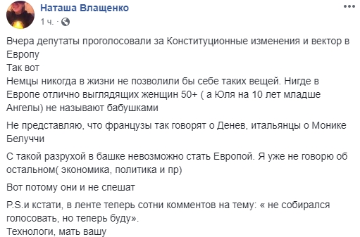 Телеведущая Наталья Влащенко тоже возмущена: "Немцы никогда в жизни не позволили бы себе таких вещей. Нигде в Европе отлично выглядящих женщин 50+ ( а Юля на 10 лет младше Ангелы) не называют бабушками. Не представляю, что французы так говорят о Денев, итальянцы о Монике Белуччи.