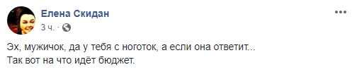 Журналистка Елена Скидан считает, что ответ Тимошенко на заставит себя ждать: "Эх, мужичок, да у тебя с ноготок, а если она ответит... Так вот на что идет бюджет".