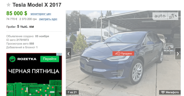 В "черную" пятницу, 23 ноября, когда в магазинах столицы проходили масштабные распродажи, из киевского автосалона во время тест-драйва угнали премиальный электромобиль Tesla Model X. Об угоне стало известно из одного из Viber-чатов, пишет "Сегодня".