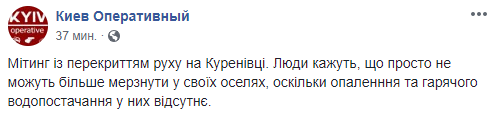 "Митинг с перекрытием движения на Куреневке. Люди говорят, что просто не могут больше мерзнуть в своих домах, поскольку отопление и горячее водоснабжение у них отсутствует", - сказано в сообщении.