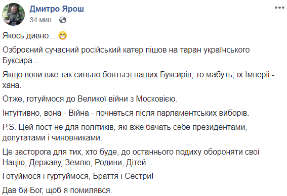 "Относительно ситуации в Азовском море. Таран нашего стратегического буксира дорого обойдется российскому агрессору. В настоящее время армада ВМС Украины в количестве двух катеров спешит на помощь к жертве провокации. Срочно собирается Совбез, который должен принять историческое решение насчет даты проведения объединительного съезда церквей. Будем держать вас в курсе эпического морского сражения. Не переключайтесь. Не отходите за семками.