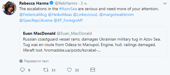 Депутат Европейского парламента Ребекка Хармс заявила о серьезном столкновении между украинским и российским кораблями утром 25 ноября. Ситуацию она прокомментировала в своем микроблоге Twitte.
