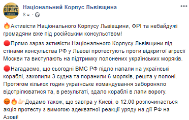 "Активисты Национального Корпуса Львовщины под стенами консульства РФ во Львове протестуют против открытой агрессии Москвы и выступают в поддержку пленных украинских моряков", - говорится в сообщении.