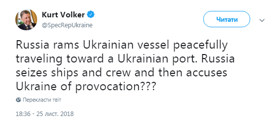 "Россия протаранила украинский корабль, мирно идущий в украинский порт. Россия захватила корабли и экипажи, и затем обвинила Украину в провокации???", - говорится в сообщении в его микроблоге.