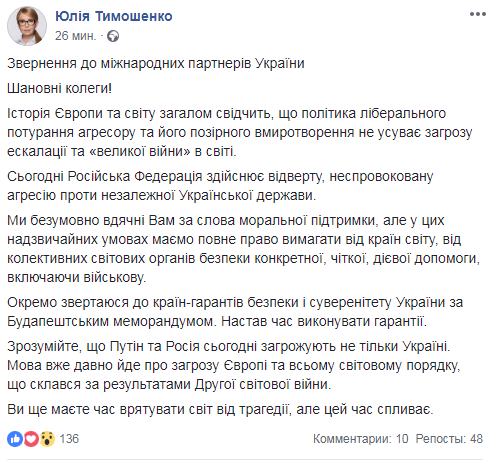 Тимошенко отдельно обратилась к странам-гарантам безопасности и суверенитета Украины по Будапештскому меморандуму и заявила, что пришло время выполнять гарантии.