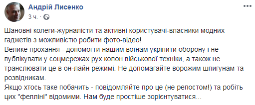 В частности, он обратился к "коллегам-журналистам и активным пользователям-владельцам модных гаджетов с возможностью делать фото-видео". Такие предостережения связаны с ситуацией в Азовском море. "Не помогайте вражеским шпионам и разведчикам", - написал Лысенко.