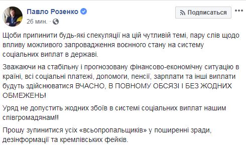 Введение в Украине военного положения из-за инцидента в Азовском море море не повлияет на выплату пенсий, заработных плат и социальных платежей. Об этом вице-премьер-министр-министр социальной политики Павел Розенко написал в Facebook.